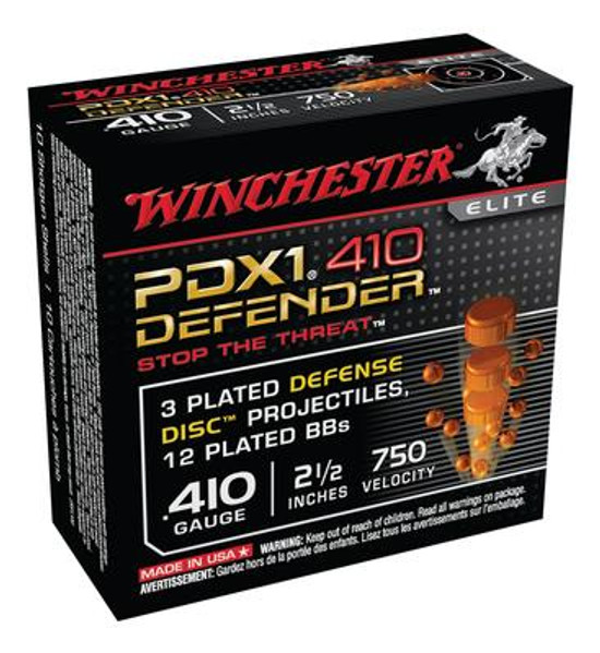 Highly effective in both 410 compatible handguns and shotguns, the 410-gauge PDX1 Defender ammunition features a distinctive black hull and black oxide high-base head; it combines four plated Defense Disc projectiles and 16 pellets of plated BB shot. The result is the ideal personal defense load for short-range engagement with the performance needed to stop threats.