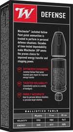 Winchester Jacketed Hollow Point pistol ammunition is trusted to perform in personal defense situations. Decades of time-tested dependability make Winchester JHP ammo the proven choice for improved energy transfer and stopping power.