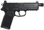 The FNX series features an ergonomic polymer frame with a low-bore axis for less felt recoil and improved control. The grip panels are checkered and ribbed for comfortable, non-snag carry. Interchangeable backstraps quickly adapt the FNX to your hand size, and the profiled stainless steel slide has cocking serrations front and rear. Ambidextrous operating controls (decocking/safety lever, slide stop, and magazine release) make the FNX perfect for competition or personal defense. The FNX Tactical features a 5.3" cold hammer-forged stainless steel barrel with .578x28 tpi and a thread protector. The FNX Tactical also has high-profile combat night sights and includes two mounting bases to accept multiple styles of optional red-dot electronic sights. It includes 2 magazines with an extended base pad and a fitted, soft Cordura nylon case. This Tactical 45 ACP model has a black frame and slide with a 15+1 capacity.