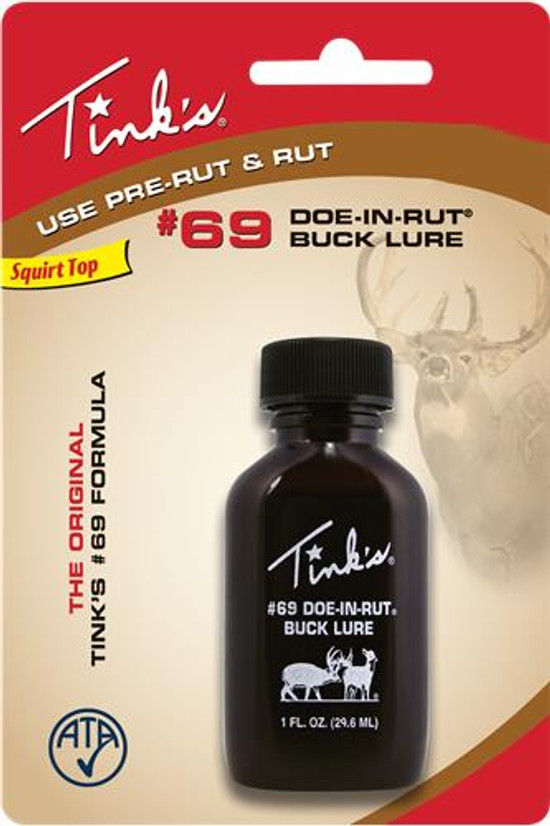 Tink's #69 Doe-In-Rut® Buck Lure is 100% natural doe estrous urine collected from live whitetail does during their estrous cycle. Tink's quality controlled formula keeps Tink's #69 Doe-In-Rut® Buck Lure at the peak level of performance. Tink's #69 Doe-In-Rut® Buck Lure, the standard on which all deer lures are measured, produces great results during the pre-rut and rut. Tink's #69 Doe-In-Rut® Buck Lure America's #1 Buck Lure!